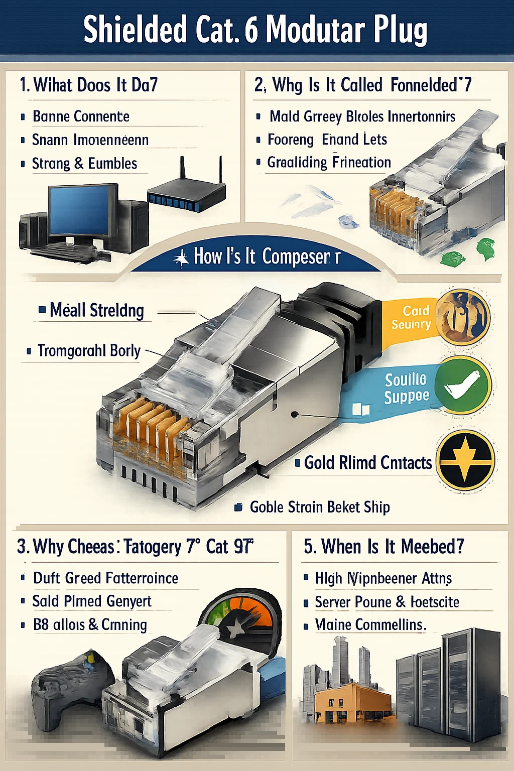 Dette skjermet Cat.6 modulær plugg , enkelt sagt, er en nettverkskabelkontakt med et "beskyttende skjold." Hvis du har sett nettverkskabelkontakter med et skinnende metallhus, er det det.