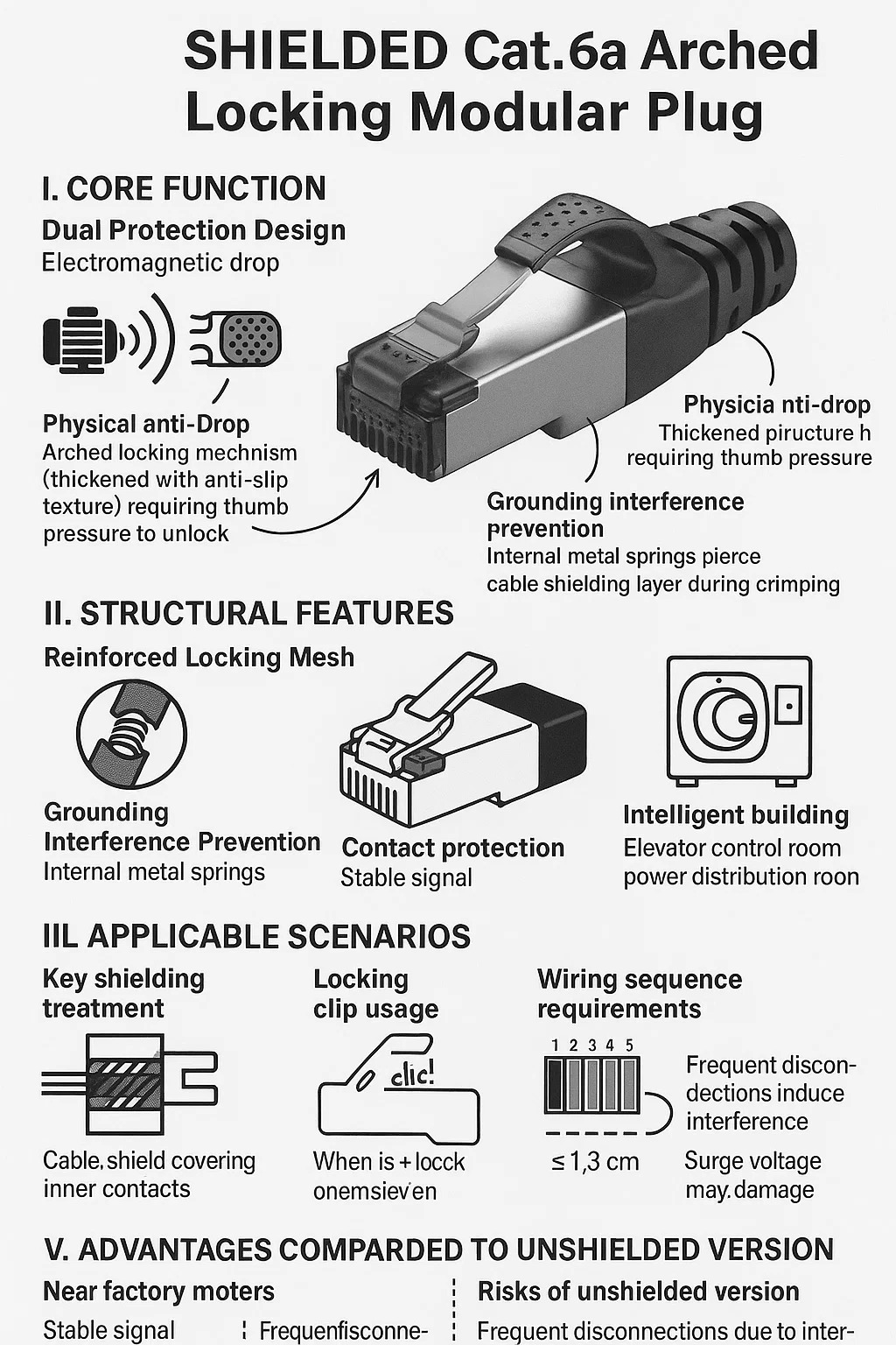 Detaljert forklaring av Skjermet Cat.6a Buet låsemodulær plugg