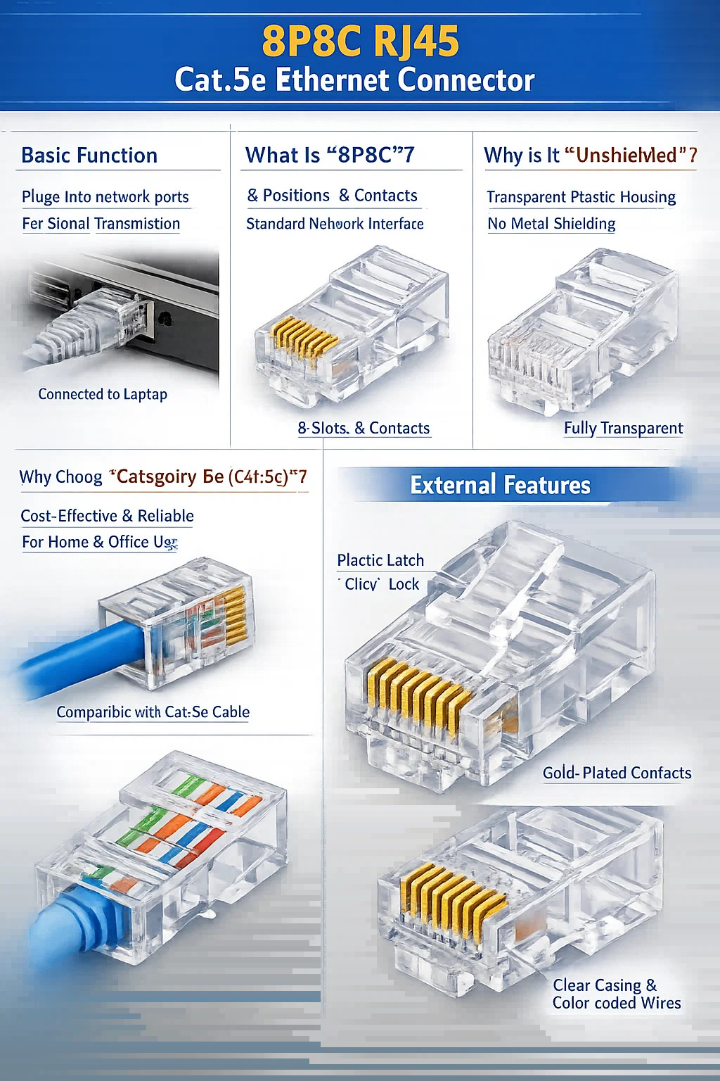 Dette uskjermet 8P8C Cat.5e modulær plugg er faktisk den vanligste typen "RJ45-kontakt" som finnes i mange hjemmebredbåndsnettverk, både i fortid og nåtid. Den er gjennomsiktig, kompakt og en grunnleggende komponent for tilkobling til et nettverk.